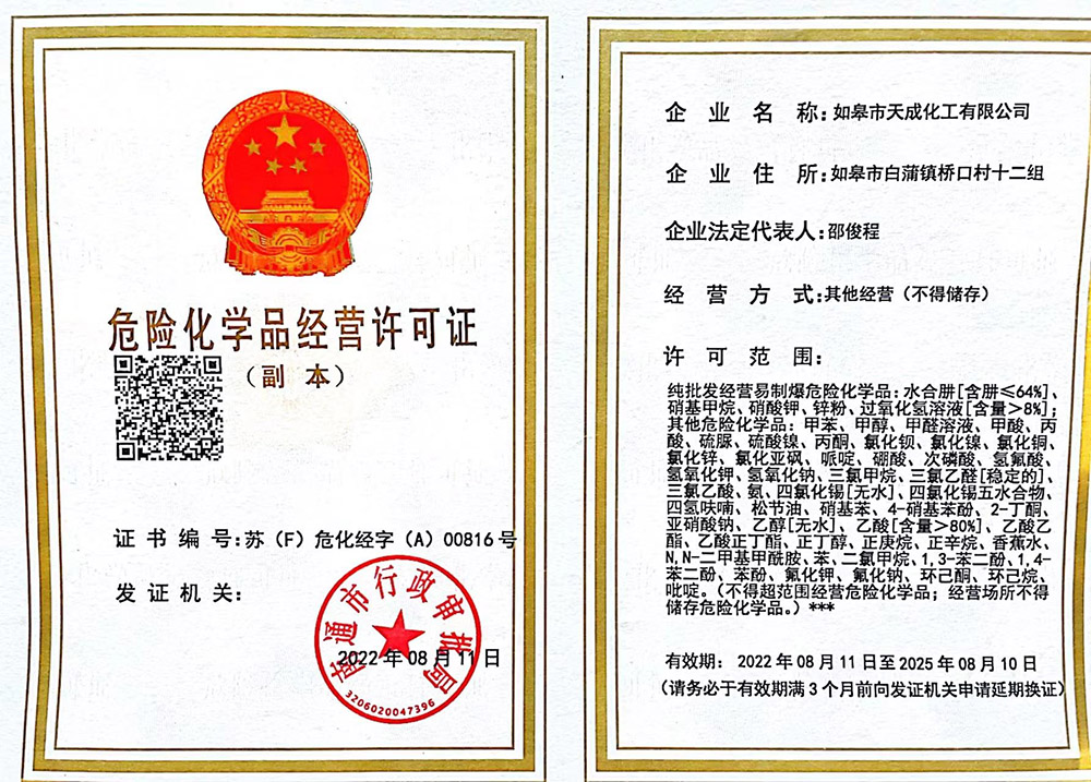 ?      如皋市天成化工有限公司創(chuàng)建于1996年。公司地處于美麗富饒的長江三角洲,座落在古鎮(zhèn)林梓,通揚運河河畔。南瀕長江、西臨204國道,距南通港、飛機(jī)場30公里,立體交通發(fā)達(dá)。公司經(jīng)營管理規(guī)范,技術(shù)力量雄厚,擁有一批高、中級專業(yè)技術(shù)人才。   公司主要產(chǎn)品為:無水四氯化錫、結(jié)晶四氯化錫、氯化亞錫、三氯乙酸、甲酸銨、苯甲酸銨、對硝基苯酚、對硝基苯甲酸、苯乙醛、癸醛、防腐劑等。產(chǎn)品品質(zhì)優(yōu)異、價格合理,主要銷往北京、上海、廣州、福州、安徽、江西等省市,并出口歐美、東南亞等國家和地區(qū),一直深受廣大新、老用戶的好評。   公司連年被評為“重合同守信用企...[更多內(nèi)容]